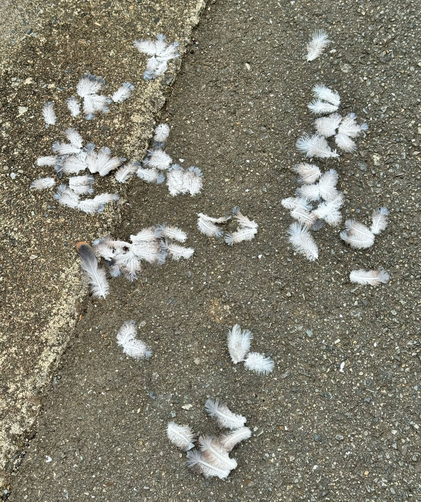 オオタカかどうかわかりませんが、こんな風に羽だけが散らかっているところを見ませんか?これらはかなりの確率で猛禽類が獲物を食べた痕です。まずは羽をむしって肉を食べていくので、このように散乱するわけです。