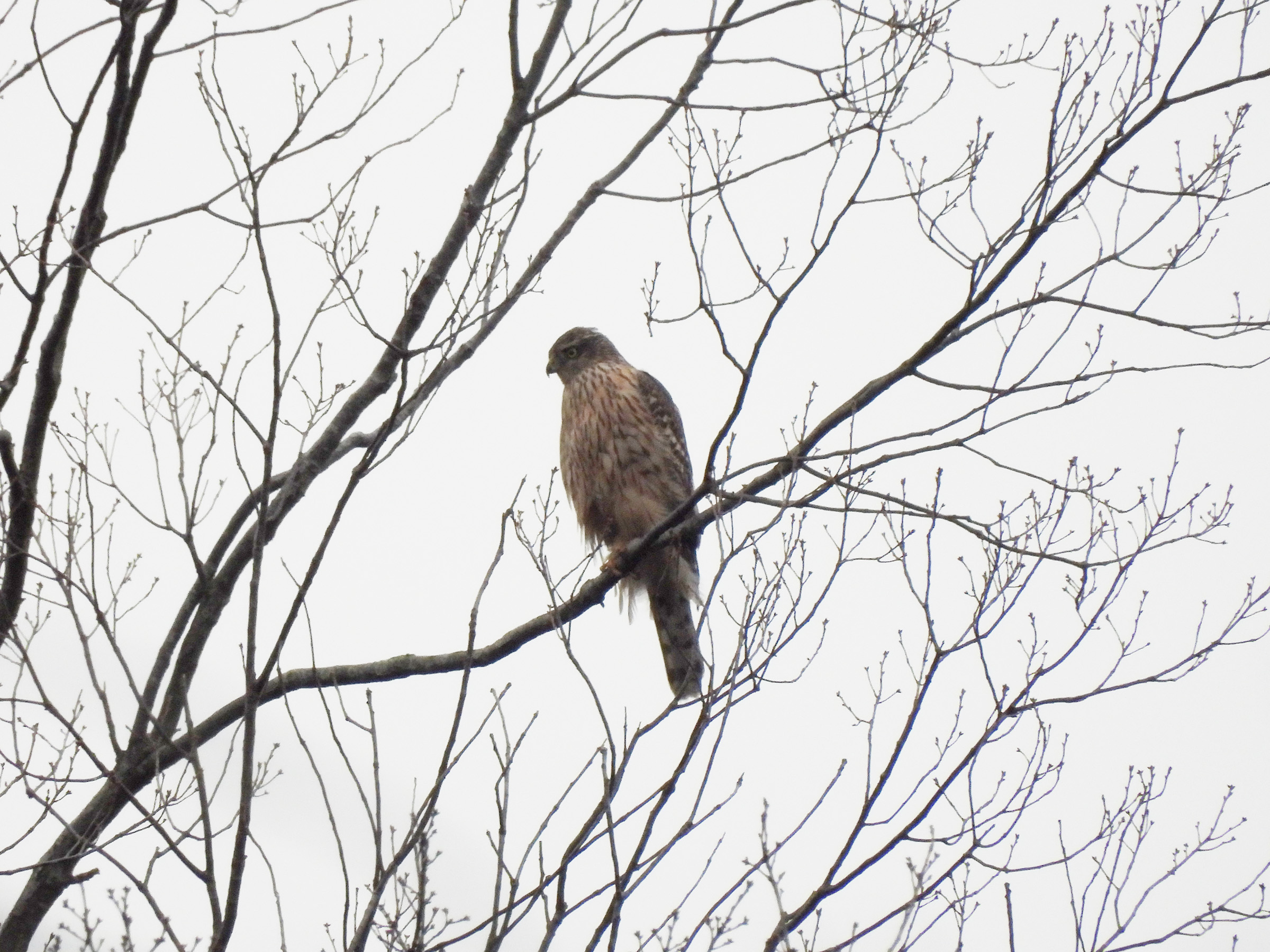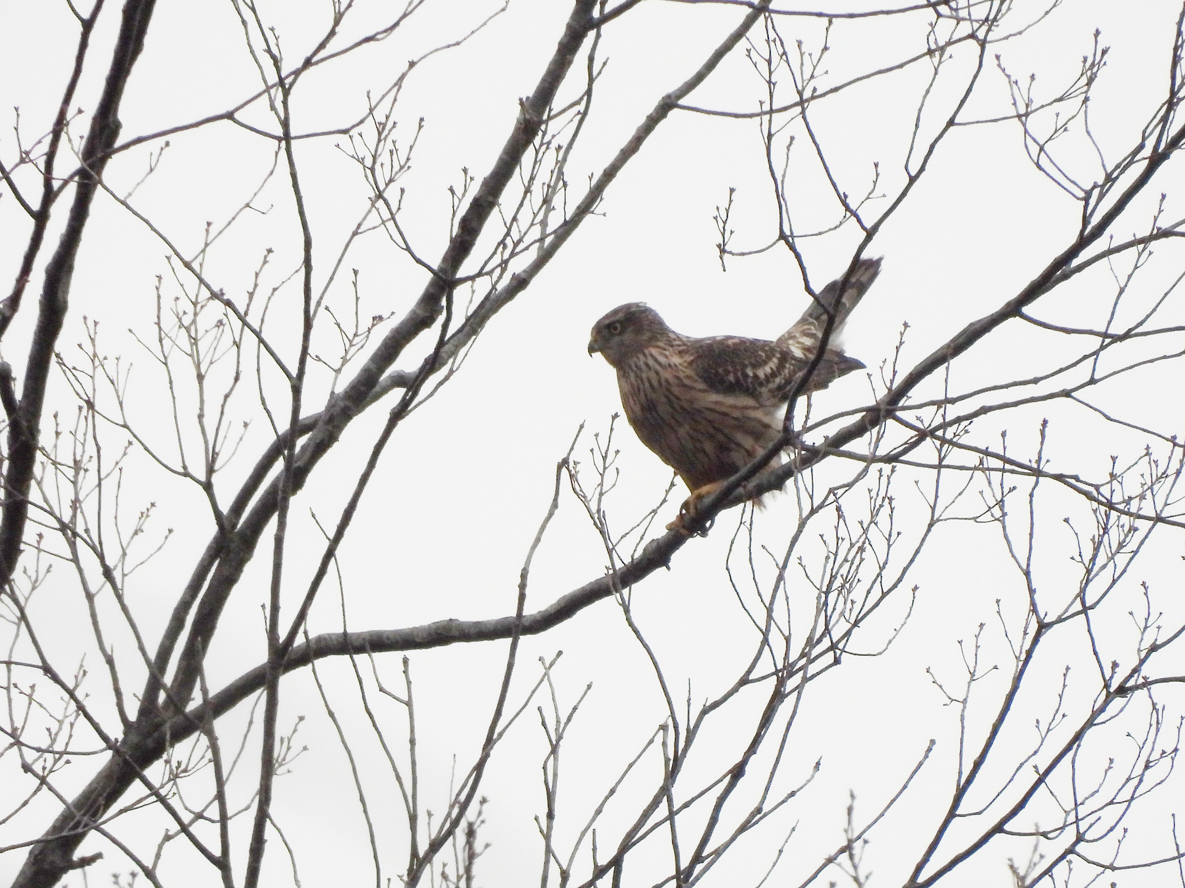 遠くに直立で留まる野鳥を発見。ズームしてみるとオオタカ若鳥(幼鳥)でした。曇天で元の写真はもっと暗いのですが、明るくしてあります。