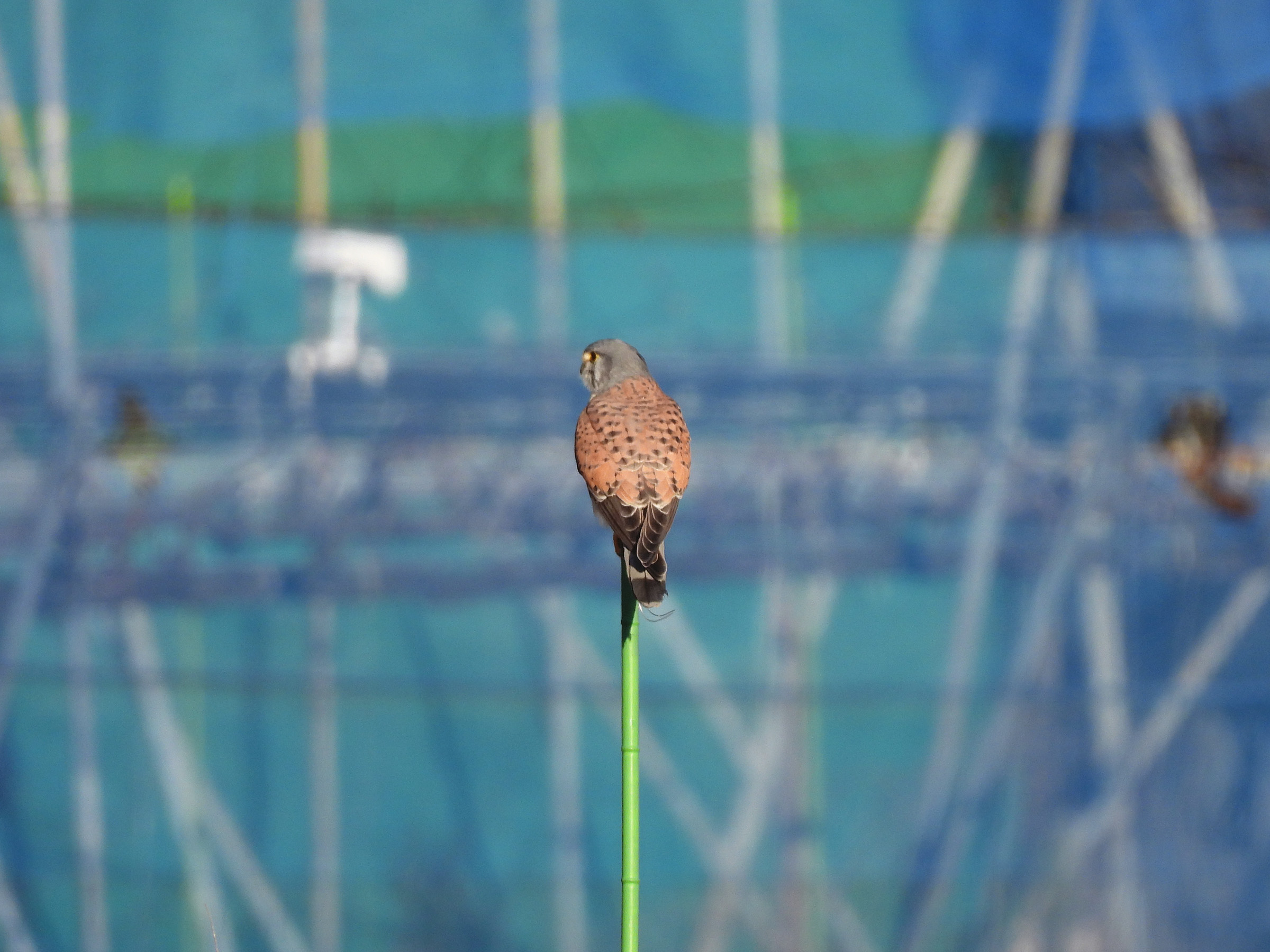 またまた移動して、今度は細い杭の先っぽに。器用に留まるものだなぁと思いますが、チョウゲンボウに取ってはお茶のこさいさい?