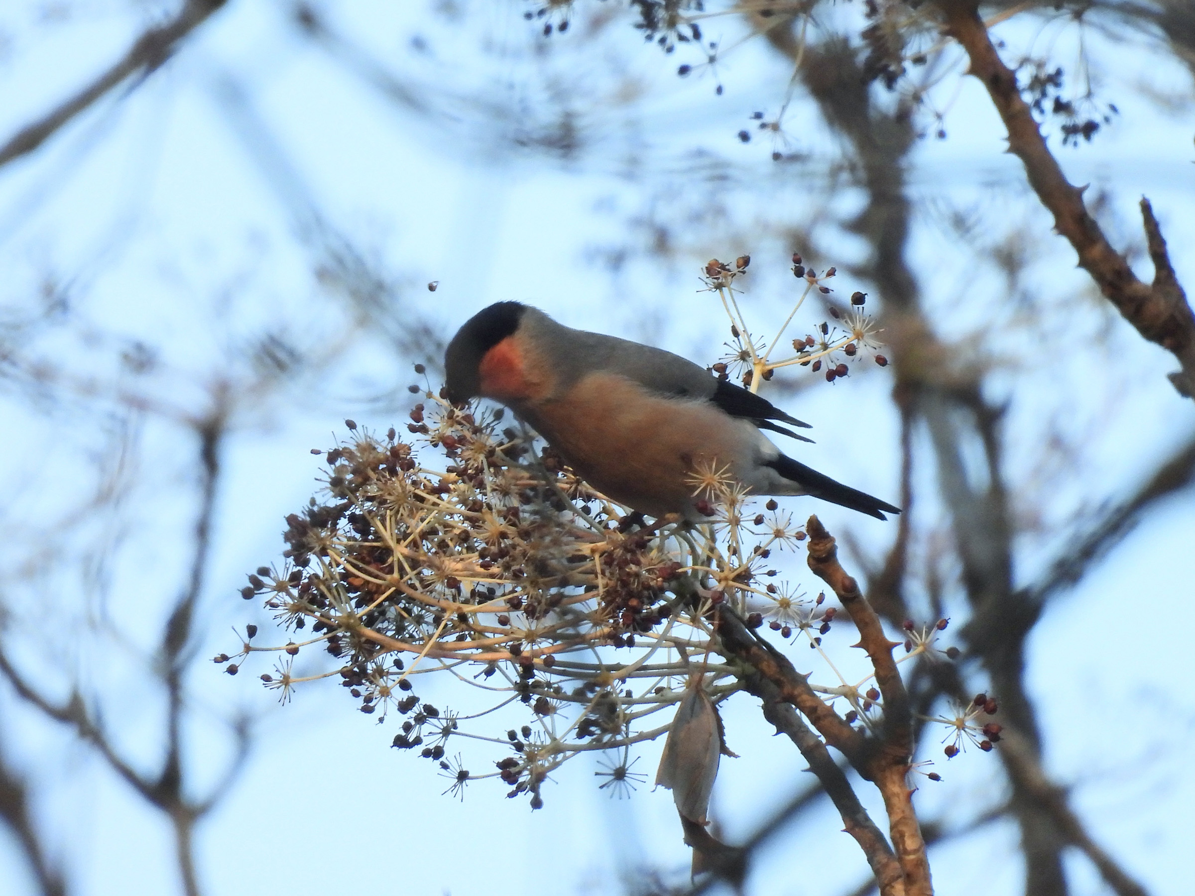 朝日を浴びているというのもありますが、お腹あたりも赤味が強いです。アカウソ?とも思えます。まあ、アカウソはウソの亜種なので、ウソには間違いないです。