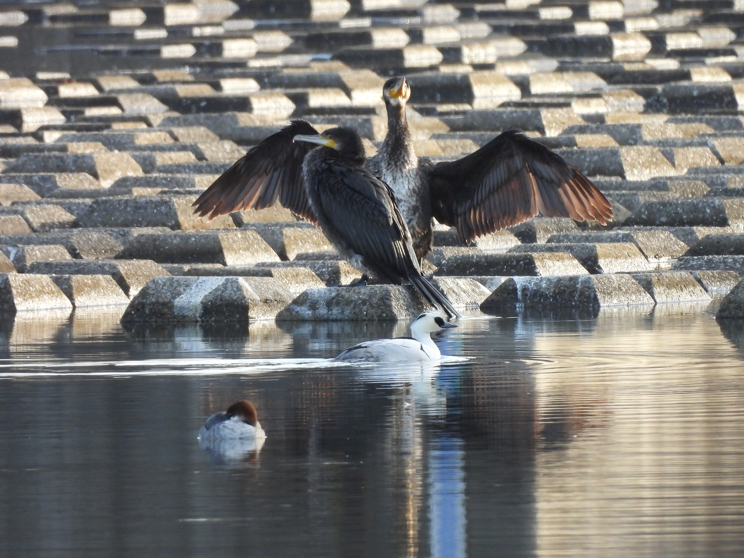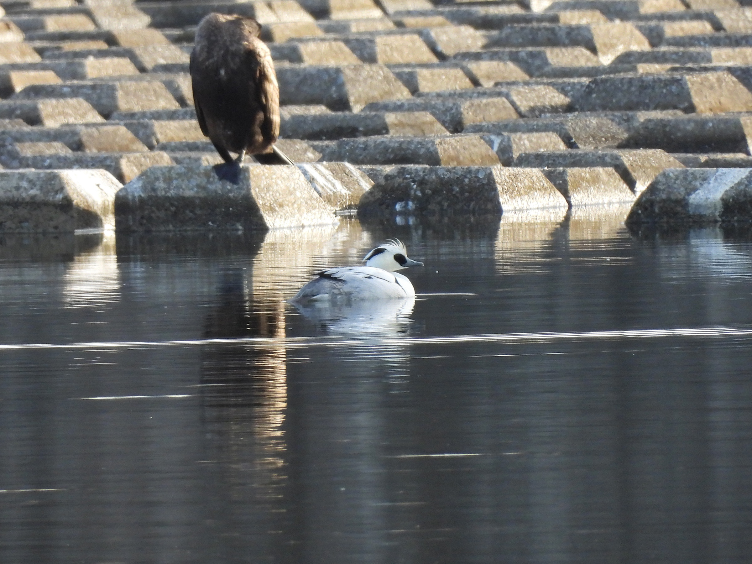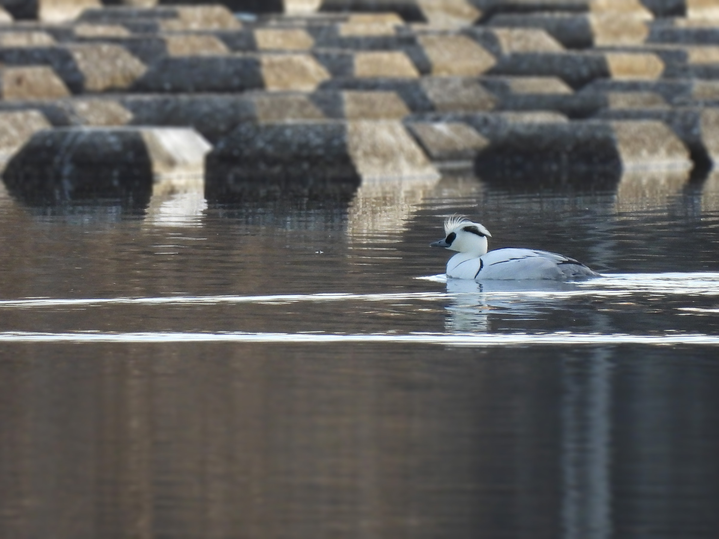 排水門の近くで、遠かったのですがなんとか。冬のこの時期にミコアイサが間近に見られるスポットとしては関東近県でも有数で、みどりの鳥地区でも自慢のスポットです。